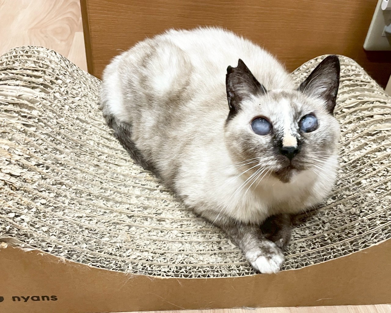 性格:全眼球炎のため全盲。1日2回右眼への点眼が必要です。見えないからか怖がりで、触るとビクッとします。反面、とても甘えん坊で、背中を撫でると垂直に立てた尻尾を小刻みに震わせながら甘えて鳴いて、舌をしまい忘れます。