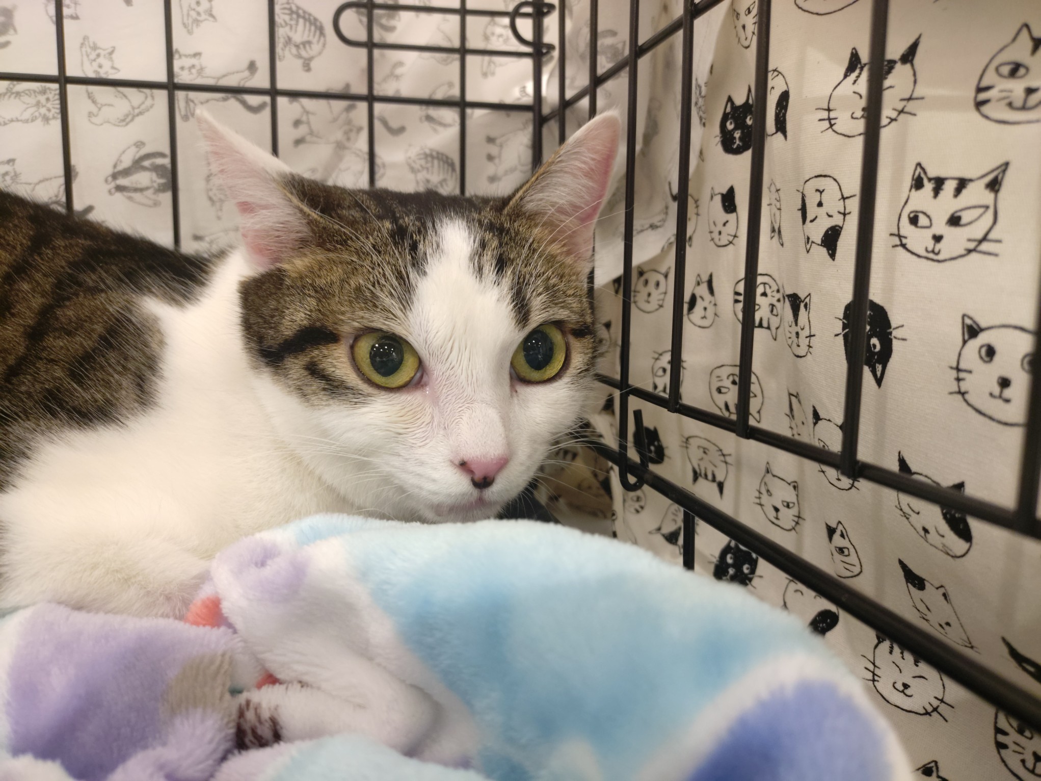 性格:少し怖がりですが、猫が大好きな女の子です。猫同士で寄り添って過ごすことが多いです。食いしん坊でごはんの時間が大好き。まん丸のお目目とお顔がとても可愛い子です。ゆっくり見守ってくださるご家庭にご縁があれば嬉しいです。